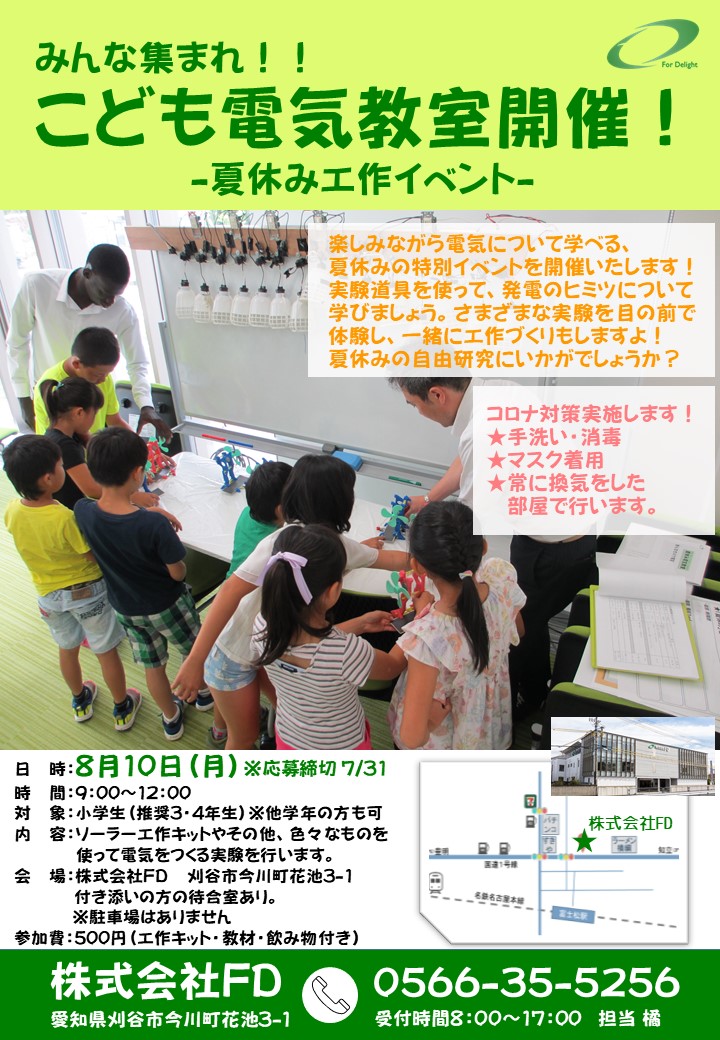 こども電気教室を開催いたします! お知らせ 2020.06.30 今年も小学生を対象とした「こども電気教室」を開催します。“電気を作る”をテーマに、太陽電池はもちろん、色々なものを使った発電実験を行います。 コンセントや乾電池以外にも、身近なものから電気を取り出せることを実験を通して学んで頂ける内容となっております。 日 時 : 8月10日(月・祝) 9時~12時 会 場 : 株式会社FD 愛知県刈谷市今川町花池3-1 対 象 : 小学3・4年生推奨 ※他学年の方も参加可 参加費 : 500円(工作キット・教材・飲み物付き) 応募先 : 0566-35-5256 担当 橘まで それではみなさんのご応募お待ちしております! お知らせ一覧へ