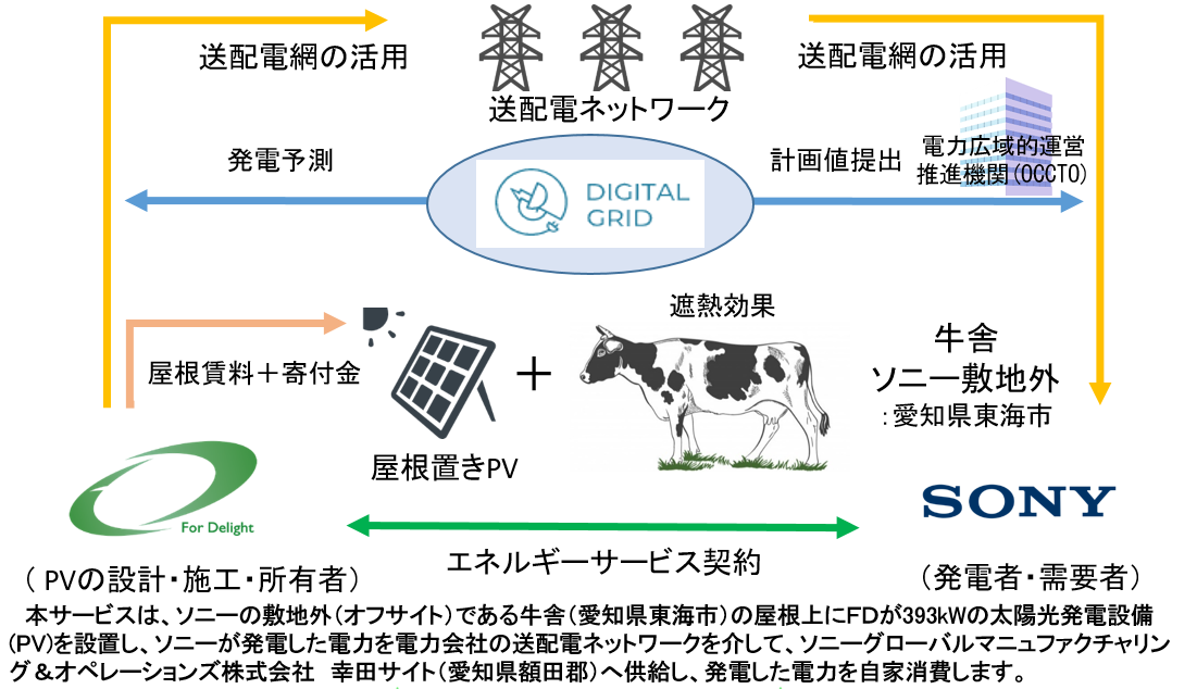 本取り組みでは、ソニー敷地外の牛舎(愛知県東海市)の屋根に設置した約400kWの太陽光発電設備で発電したソニーグループの電力を、電力会社の送配電ネットワークを介し、約30km離れたソニーグローバルマニュファクチャリング&オペレーションズ株式会社の幸田サイト(愛知県額田郡)へ供給(自己託送)することにより、この発電した電力の自家消費を実現します。